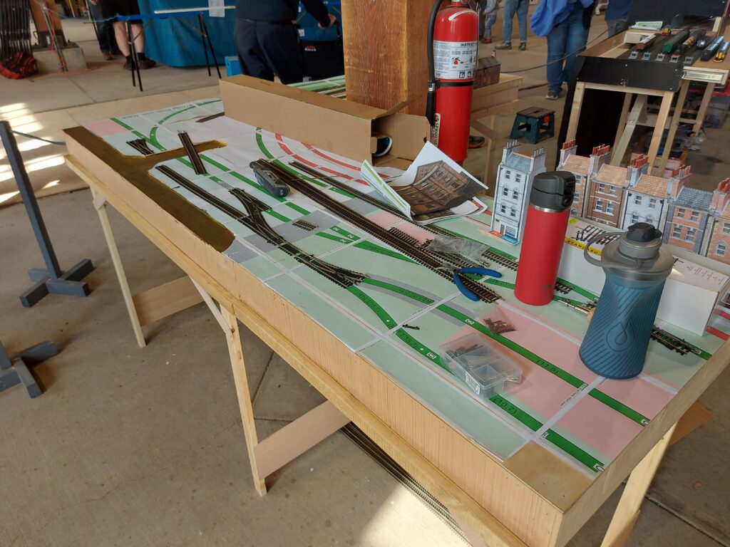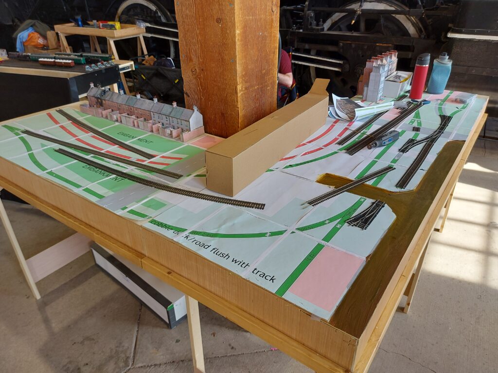 While operating The Branchline, we set-up the two canal/industrial corner boards of Chuffingham with the SCARM printouts of the track plan for the first full scale look at this shunting section. We demonstrated how track and points are layed and connected. Some existing buildings and thermos bottles were added for atmosphere!